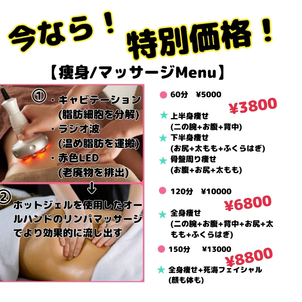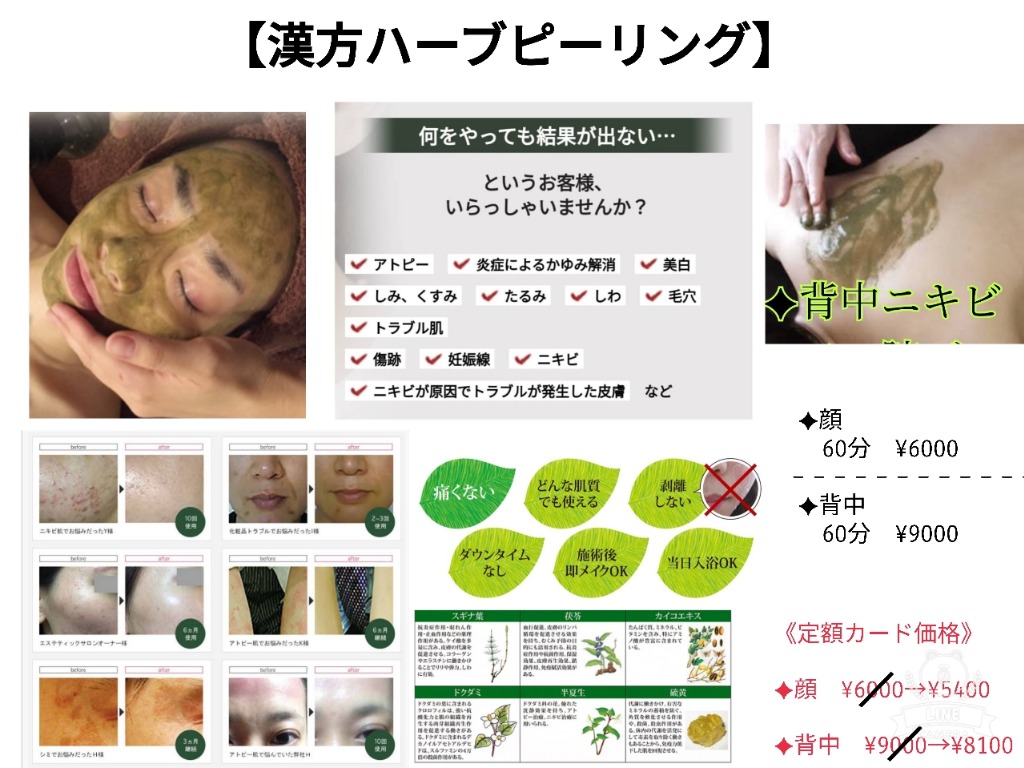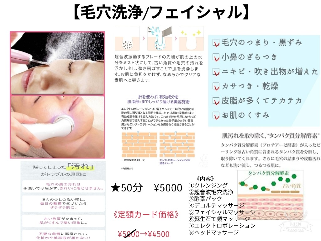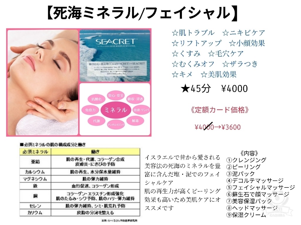 ●死海ミネラル/フェイシャルや●毛穴洗浄/フェイシャルや●漢方ハーブピーリングの3種類のフェイシャルメニューを提供しております