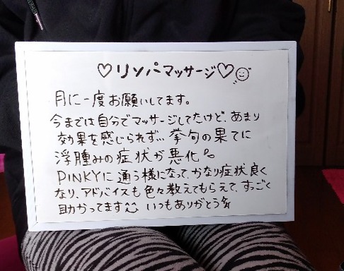浜松市北区リンパ専門サロン-salon-Pinky♡です女性特有の病気になってしまい子宮を摘出してから脚の浮腫や痛みが酷くリンパマッサージ下半身集中でケアする様にはじめの頃は浮腫がホントに酷く辛そうでしたが定期的に通っていくうちに浮腫具合が楽になっていくのを実感していただいてます子宮の悩み、お腹の不調は脚にものすごくでます女性は下半身太りやお腹太りも悩みだと思いますまずリンパマをしっかり流して実感してみて下さい♡