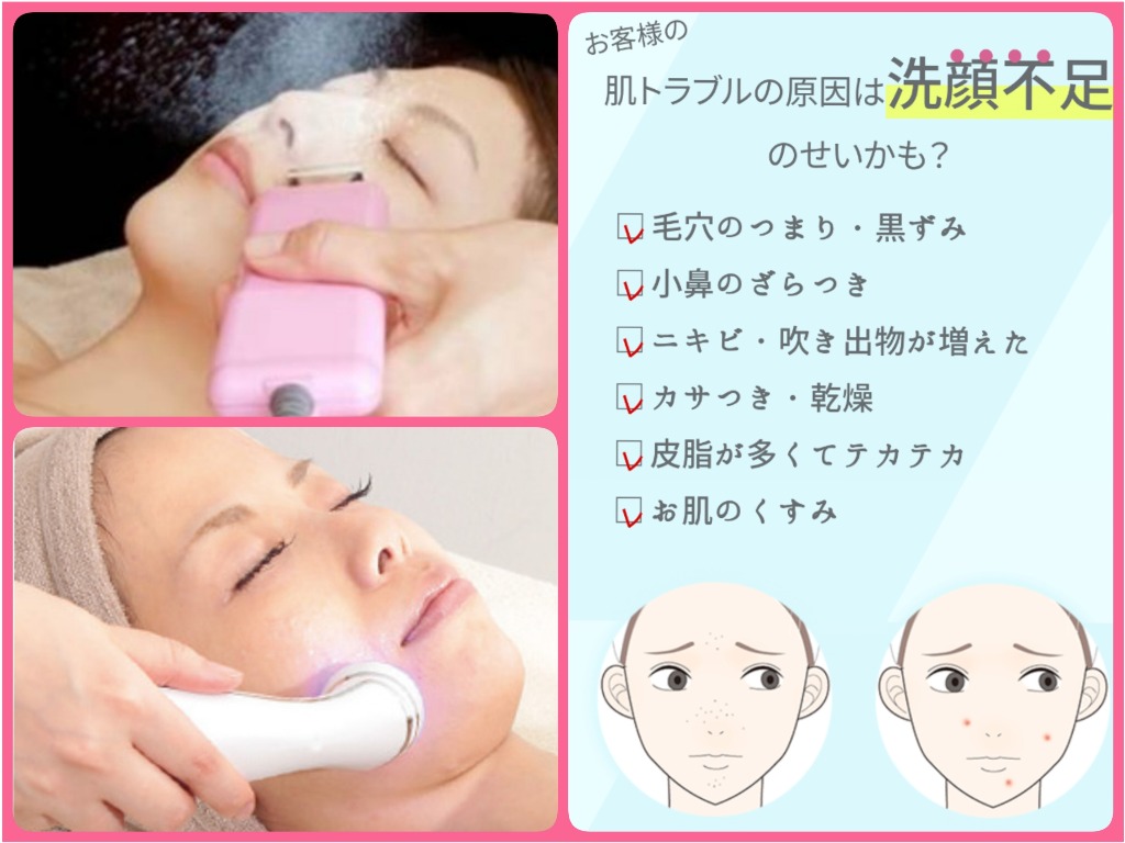 超音波洗浄器を使用し洗顔で取り除けない毛穴の汚れやザラつき、化粧カスや古い角質をオフします